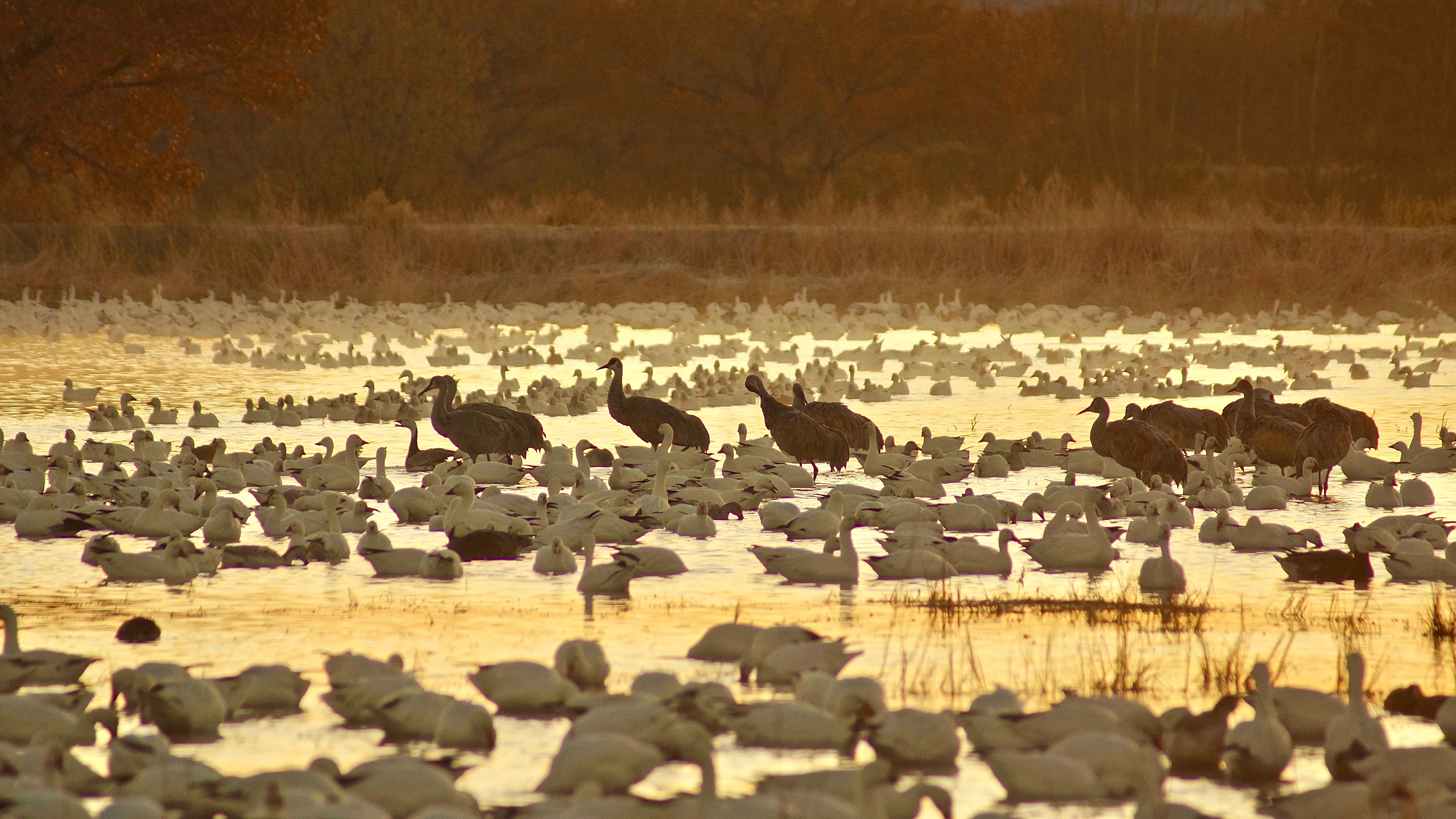 Every November, New Mexico holds the Festival of the Cranes to celebrate the migratory return of Sandhill Cranes to the wetlands along the Rio Grande River. In addition to the cranes, there are tens of thousands of ducks and geese that migrate to the area as well.